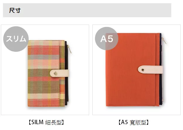 可放入智慧型手機的SILM細長型尺寸,是適合手握的尺寸,適合經常要手拿手帳移動的您;連迷你平板機器也都能收納的A5寬版型,有傲人的收納空間,小物不知不覺間增多了、或習慣帶很多支筆在身上的您,A5寬版型是您的絕佳夥伴。